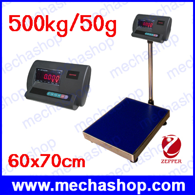 เครื่องชั่งดิจิตอลตั้งพื้น 500kg ค่าละเอียด 50g แท่นชั่งเป็นเหล็กฝาครอบเป็นสเเตนเลสขนาด 60x70cm ยี่ห้อ ZEPPER รุ่น A12E-PB6070-500Kg (จีน)