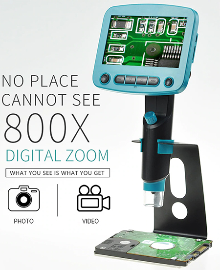 This is a digital microscope that can be continuously magnified 800 times. It has a 4.3-inch display and the object that being observed appears directly on the screen. At the same time, the elevation angle of the display can be adjusted freely within a certain range, which is convenient for the user to observe in multiple directions.