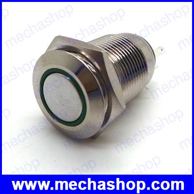 สวิทซ์กดติดปล่อยดับ มีไฟ LED วงแหวนสีเขียว 12V 16mm Flat round momentary ring lamp waterproof IP67 switch 1635F