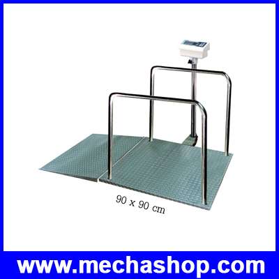 เครื่องชั่งน้ำหนัก ชั่งพร้อมรถเข็น ออกแบบมาเพื่อเพิ่มความสะดวกสบายในการชั่งน้ำหนักให้กับผู้ป่วย โดยที่เครื่องชั่ง สามารถชั่งน้ำหนักพร้อมรถเข็นได้ โดยมีทางลาดให้รถเข็นขึ้นได้ เครื่องชั่งยังมีราวจับที่ทำจากสแตนเลสเพื่อให้ผู้ป่วยยืนทรงตัว