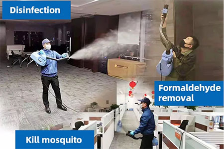 chlorine-containing disinfectant (chlorine dioxide), which is green and healthy, and has no harmful residues. It can effectively kill all kinds of pathogenic microorganisms including coronavirus on the air and the surface of the object, and it has played a vital role in preventing the virus during the SARS period. This solution uses a multifunctional ultra-fine particle atomizer to atomize the chlorine-containing disinfectant. The diameter of the particles emitted by the atomizer is less than 1 ~ 1.75um, which can be easily dispersed to high places and all corners of the space.